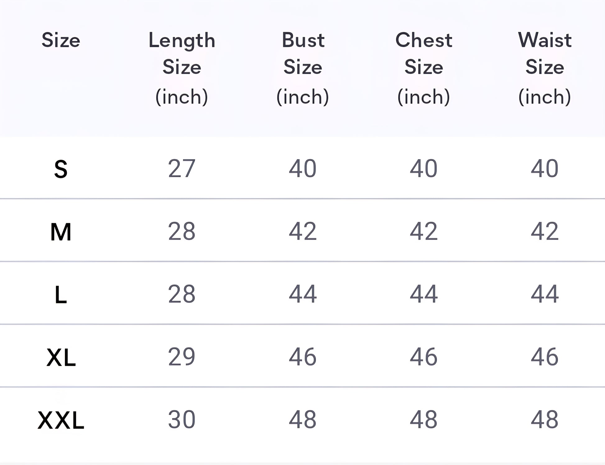 XXL (Chest Size: 48 in, Length Size: 30 in, Waist Size: 48 in, Hip Size: 48 in)Β